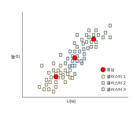 - 세 개의 중심은 클러스터에 속한 각 개의 평균 키와 평균 몸길이를 나타낸다.