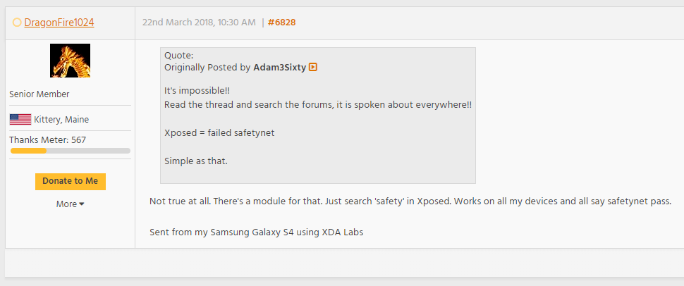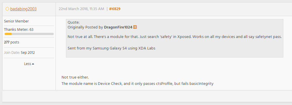 - Systemless Xposed를 설치하여도 SafetyNet을 우회할 수 없다고 말함.(Systemless Xposed does not pass SafetyNet!!!)