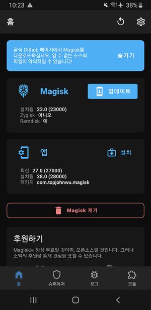 - magisk 및 관리앱을 23.0을 설치한후 업데이트 하는것을 추천한다. 모듈을 사용할수없기 때문에 수동으로 설치해야하지만 개발자도 비추를 하고있기때문에 잘모르겠으면 구버젼을 먼저 설치하자 대표적으로 ViPER4Android 앱을 사용할수 없다.