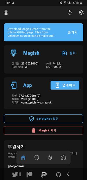 - 현재 정식버젼은 28.0이며 아마 단말기가 32bit인 경우이다. magisk 및 관리앱은 23.0을 사용해보자 24.0~ 64bit만 가능 2024년 10월 24일 기준 27.0 업데이트만 지원되지만 https://github.com/topjohnwu/magisk/releases 들어가서 28.0.apk를 설치하기 전에 모듈에서 저장소에서 설치 또는 magisk 설치 옵션후 파일 선택 및 패치로는 업데이트가 안된다. 28.0을 먼저 설치 한후 업데이트를 진행하도록 하자 앱에 최신 27.0(27000)으로 뜨지만 설치됨 28.0(28000)으로 되며 그 상태에서 magisk 설치를 시도하면 28.0이 활설화 된다.