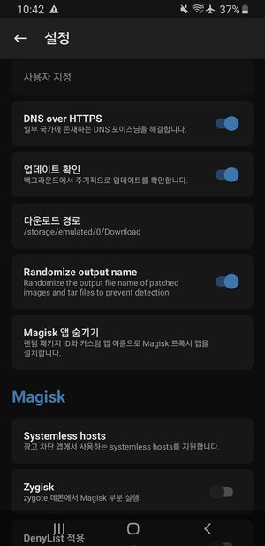 - Magisk Hide가 사라졌으며 Zygisk에는 대신 deny list=(Magisk Hide)가 있지만 유튜브 비교영상을 보면 Magisk Hide가 훨씬 좋다