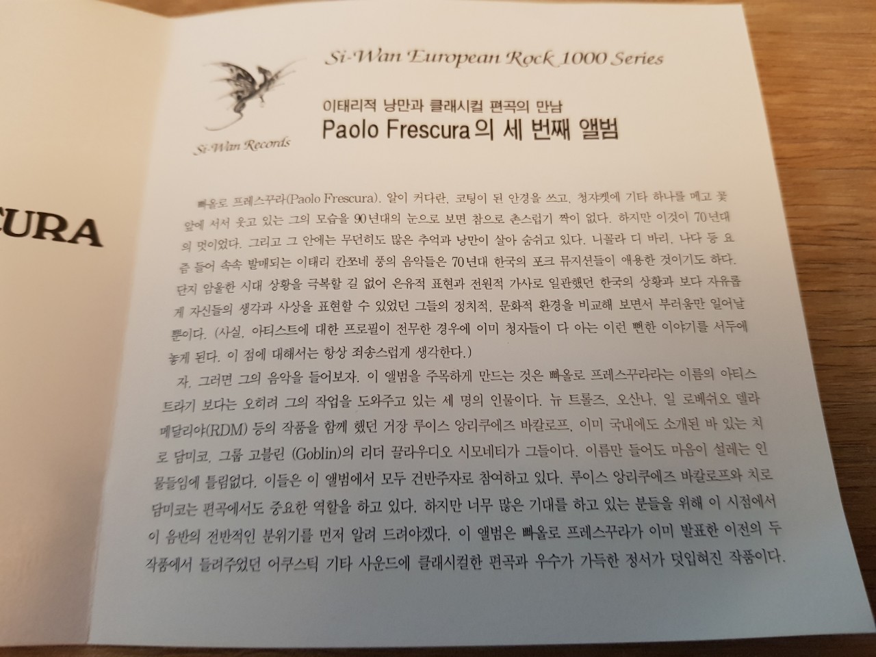 이태리적 낭만과 클래시컬 편곡의 만남 빠올로 프레스꾸라(Paolo Frescura). 알이 커다란 코팅이 된 안경을 쓰고, 청쟈켓에 기타 하나를 메 고 꽃앞에 서서 웃고 있는 그의 모습을 90년대의 눈으로 보면 참으로 촌스럽기 짝이 없다. 하지만 이 것이 70년대의 멋이었다. 그리고 그 안에는 무던히도 많은 추억과 낭만이 살아 숨쉬고 있다. 니꼴라 디 바리, 나다 등 요즘 들어 속속 발매되는 이태리 깐쪼네 풍의 음악들은 70년대 한국의 포크 뮤지션 들이 애용한 것이기도 하다. 단지 암울한 시대 상황을 극복할 길 없어 은유적 표현과 전원적 가사로 일관했던 한국의 상황과 보다 자유롭게 자신들의 생각과 사상을 표현할 수 있었던 그들의 정치적, 문 화적 환경을 비교해 보면서 부러움만 일어날 뿐이다. (사실 아티스트에 대한 프로필이 전무한 경우에 이미 청자들이 다 아는 이런 뻔한 이야기를 서두에 놓게 된다. 이 점에 대해서는 항상 죄송스럽게 생 각한다.)