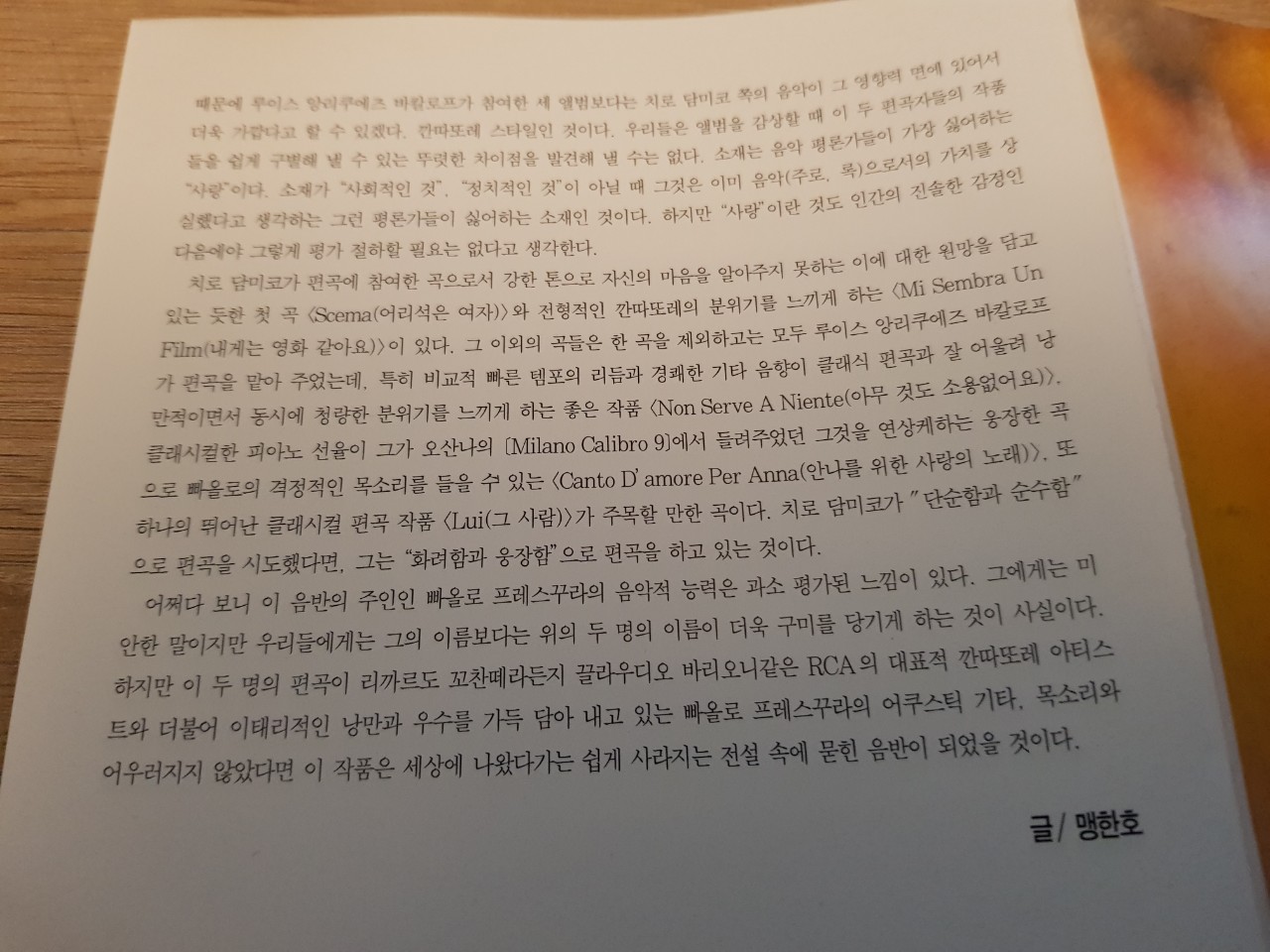 어쩌다 보니 이 음반의 주인인 빠올로 프레스꾸라의 음악적 능력은 과소 평가된 느낌이 있다. 그에 게는 미안한 말이지만 우리들에게는 그의 이름보다는 위의 두 명의 이름이 더욱 구미를 당기게 하는 것이 사실이다. 하지만 이 두 명의 편곡이 리까르도 꼬찬떼라든지 끌라우디오 바리오니같은 RCA의 대표적 깐따또레 아티스트와 더불어 이태리적인 낭만과 우수를 가득 담아 내고 있는 빠올로 프레스꾸 라의 어쿠스틱 기타, 목소리와 어우러지지 않았다면 이 작품은 세상에 나왔다가는 쉽게 사라지는 전 설 속에 묻힌 음반이 되었을 것이다.